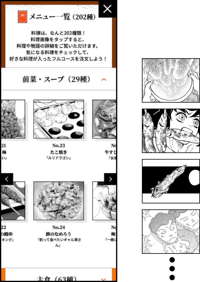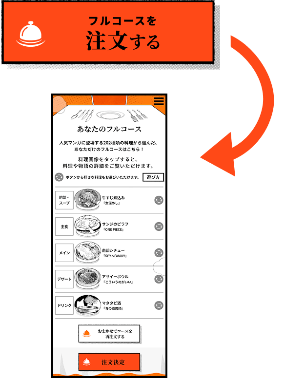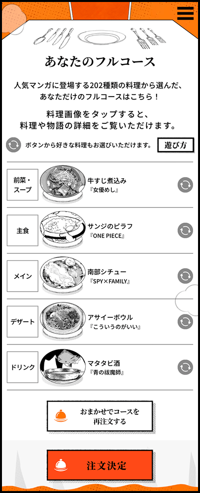 全202種類の料理から前菜・主食・メイン・デザート・ドリンクのフルコースをランダムでご提案!